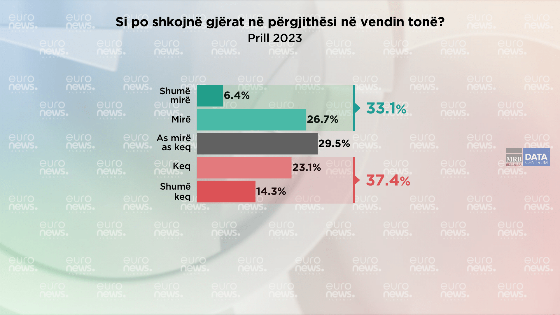 Barometri në Euronews Albania ka pyetur qytetarët se si po shkojnë gjërat në vendin tonë në muajin prill. 37.4% e shqiptarëve mendojnë se gjërat në vendin tonë po shkojnë keq, 29% mendojnë se gjërat po shkojnë as mirë e as keq dhe 33.1% mendojnë se gjërat po shkojnë mirë.