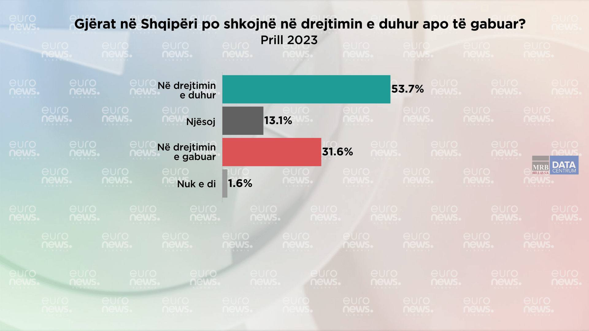 53.7% e qytetarëve mendojnë se gjerat në vendin tonë po shkojnë në drejtimin e duhur, 13.1% e tyre mendojnë se gjërat po shkojnë njësoj dhe 31.6% mendojnë se gjërat po shkojnë në drejtimin e gabuar.