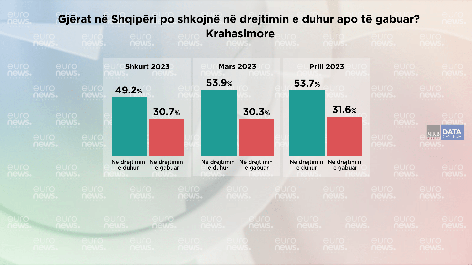 Por ky mendim ka ndryshuar ndër muaj. Qytetarët që mendojnë se gjërat po shkojnë në drejtimin e duhur në muajin shkurt ishin 49.2%, janë bërë 53.9% në mars dhe 53.7% në prill.