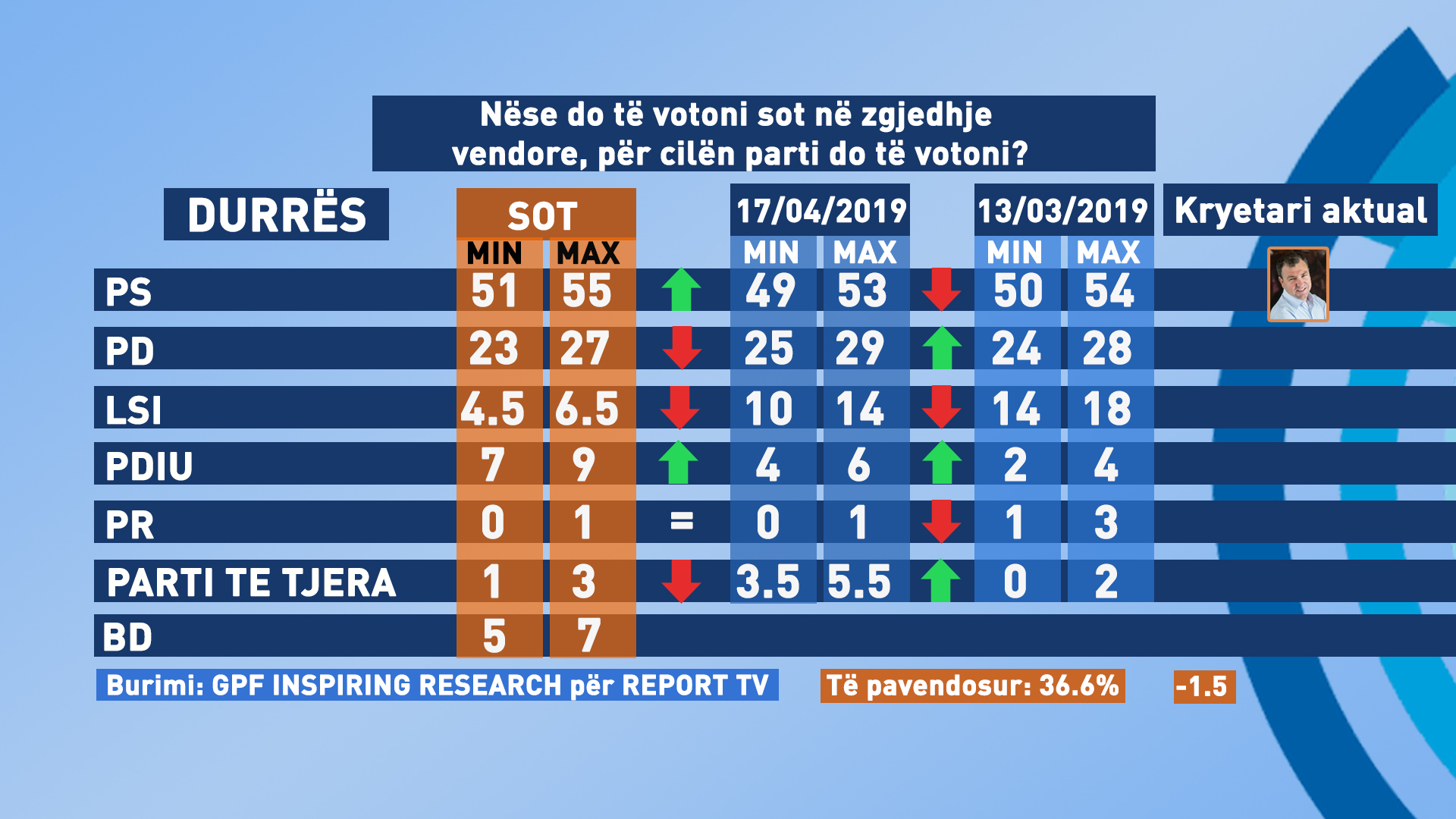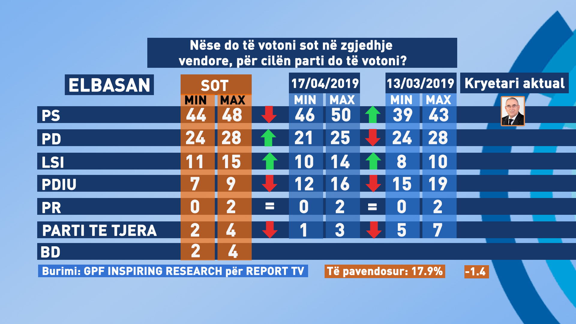 61 % e fierakëve e pyetur nga GPF Inspiring Research, nëse zgjedhjet do mbaheshin sot do votonin PS, e cila vazhdon të ketë të njëjtin rezultat me sondazhin e mëparshëm. PD do pësonte një rritje ndërsa vihet re se LSI do përsote një rënie të ndjeshme. Edhe Bindja Demokratike do rrëmbente disa zgjedhës. /i.h