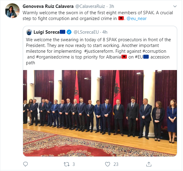 “Mirëpresim ngrohtësisht betimin për tetë anëtarët e parë të SPAK. Një hap thelbësor për të luftuar korrupsionin dhe krimin e organizuar në Shqipëri”, shkruan Calavera.