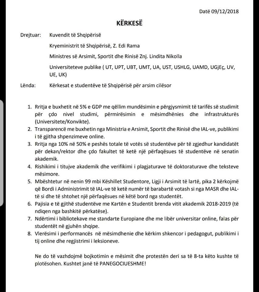 Studentët kanë zgjeruar listët e kërkesave për një arsim cilësor në Shqipëri, në letrën drejtuar Kuvendit, Kryeministrisë (e veçanërisht kryeministrit Rama), MAS-së dhe konkretisht ministres Lindita Nikolla, por edhe universiteve publike në vend.