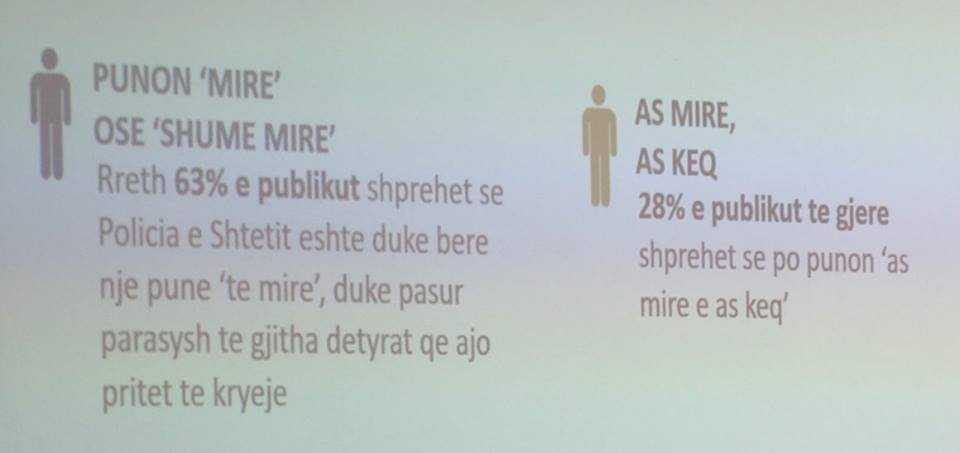 Sipas studimit kur qytetarët pyeten se sa mirë e bën punën Policia e Shtetit, 63% e publikut shprehen se ajo është duke bërë një punë të mirë ose shumë të mirë.