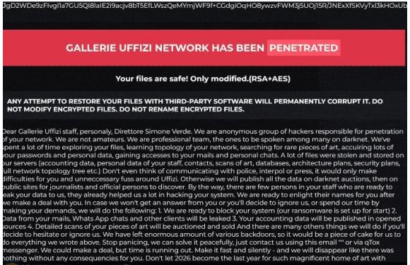 Në mesazhin që hakerët i dërguan drejtorit të Uffizit, ata e quajnë veten një “skuadër profesionale”, duke treguar se kanë kaluar shumë kohë duke studiuar sistemet dhe vjedhur të dhëna të ndjeshme, siç janë llogaritë financiare, informacionet personale të punonjësve dhe skanime të veprave të artit. Ata kanë kërcënuar se, nëse nuk paguhet shuma që kërkojnë, do të publikojnë të dhënat në internet dhe do t’i shesin ato.