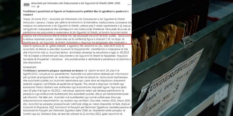 Tiranë, 26 korrik 2022 – Autoriteti për Informimin mbi Dokumentet e ish-Sigurimit të Shtetit, institucion i pavarur, i krijuar për qëllime të informimit të individëve, institucioneve, studiuesve dhe mediave me dokumentet e ish-Sigurimit të Shtetit, ushtron prej 5 vitesh veprimtarinë e tij, bazuar në ligjshmëri, transparencë dhe bashkëpunim me institucionet shtetërore. Në kuadër të punës së përditshme me përpunimin e materialeve të ish-Sigurimit të Shtetit, së fundmi Autoriteti është ndeshur me informacione dhe të dhëna mbi një personazh me profil të lartë politik. Institucionit iu kërkua nëpërmjet postës elektronike që të verifikohej figura e shtetasit I. M. në dosje të klasifikuara të ish-Sigurimit të Shtetit.