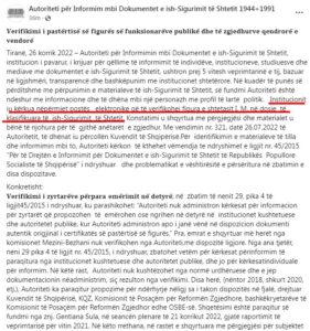 Vendimi tjetër, – i marrë në përgjigje të kërkesës individuale, – shprehet që po i njëjti subjekt rezulton me dokumente të ish-Sigurimit të Shtetit.