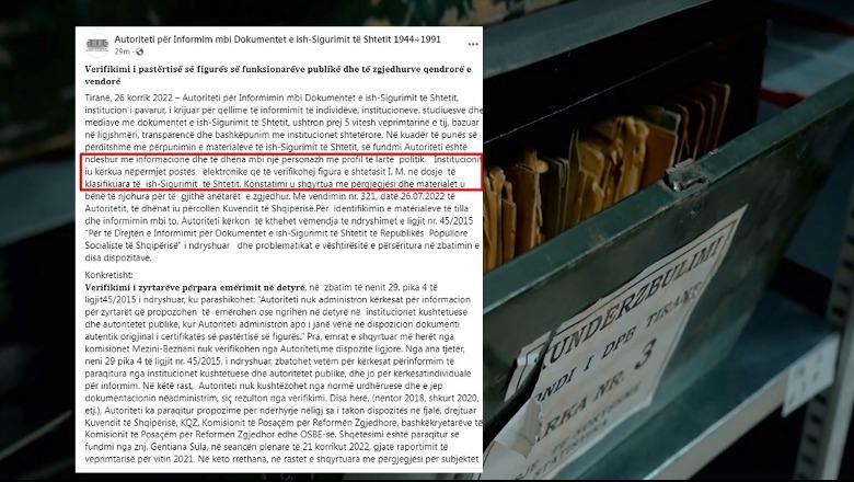 Tiranë, 26 korrik 2022 – Autoriteti për Informimin mbi Dokumentet e ish-Sigurimit të Shtetit, institucion i pavarur, i krijuar për qëllime të informimit të individëve, institucioneve, studiuesve dhe mediave me dokumentet e ish-Sigurimit të Shtetit, ushtron prej 5 vitesh veprimtarinë e tij, bazuar në ligjshmëri, transparencë dhe bashkëpunim me institucionet shtetërore. Në kuadër të punës së përditshme me përpunimin e materialeve të ish-Sigurimit të Shtetit, së fundmi Autoriteti është ndeshur me informacione dhe të dhëna mbi një personazh me profil të lartë politik. Institucionit iu kërkua nëpërmjet postës elektronike që të verifikohej figura e shtetasit I. M. në dosje të klasifikuara të ish-Sigurimit të Shtetit.