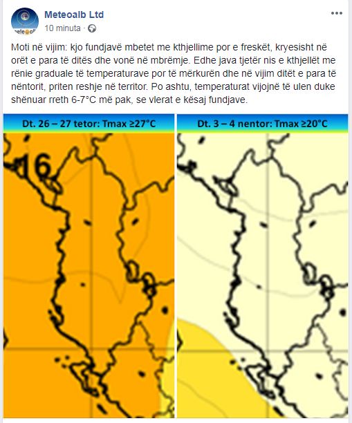 “Moti në vijim: kjo fundjavë mbetet me kthjellime por e freskët, kryesisht në orët e para të ditës dhe vonë në mbrëmje. Edhe java tjetër nis e kthjellët me rënie graduale të temperaturave por të mërkurën dhe në vijim ditët e para të nëntorit, priten reshje në territor. Po ashtu, temperaturat vijojnë të ulen duke shënuar rreth 6-7°C më pak, se vlerat e kësaj fundjave”, thuhet në njoftimin e “Meteoalb”.