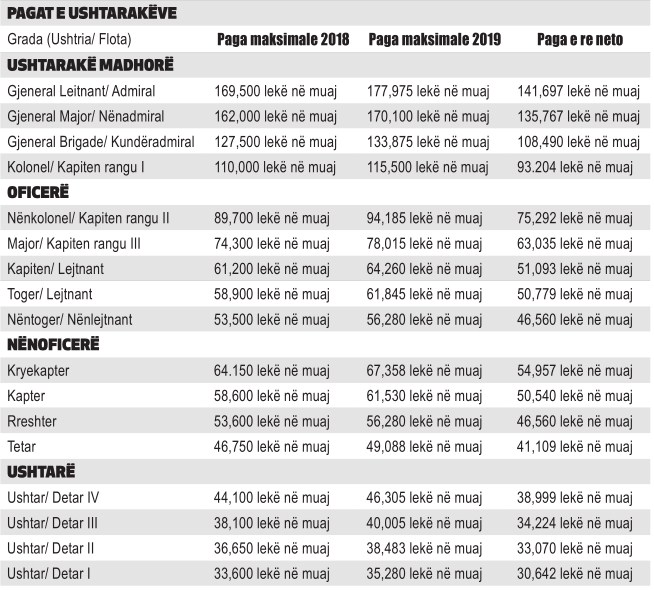 Pagat e ushtarakëve, do të pësojnë rritje që e çojnë rrogën më të lartë për nënoficerët në 67 mijë lekë, për oficerët 94 mijë lekë, ndërsa për ushtarët rroga maksimale do të jetë 46 mijë lekë në muaj. Ndërsa rroga e nje gjenerali me tre yje, apo e admiralit në flotën ushtarake do të jetë 178 mijë lekë.