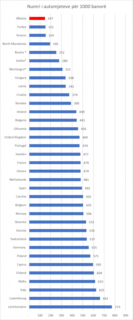 Në anën tjetër të shkallës, numri më i ulët i automjeteve u regjistrua në Shqipëri me 146.7, Kosovë dhe Turqi.