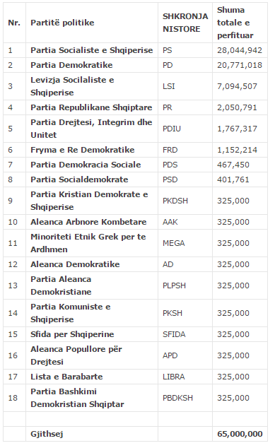 Kodi Zgjedhor në nenin 87, pika 1, përcakton se, partitë politike pjesëmarrëse në zgjedhje dhe që kanë marrë jo më pak se 0.5 për qind të votave në shkallë vendi, përfitojnë fonde nga Buxheti i Shtetit, në bazë të numrit të votave që secila parti ka marrë në ato zgjedhje.