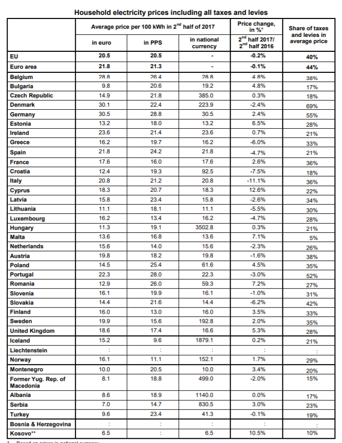 Në të gjithë shtetet anëtare të BE-së, çmimet e energjisë elektrike për konsumatorët familjarë në gjysmën e dytë të vitit 2017 shkonin nga nën 10 euro në 100 kwh në Bullgari, në më shumë se 30 euro për 100 Kwh në Danimarkë dhe Gjermani. Ndërsa çmimet e gazit të amvisërisë ranë me 0.5% mesatarisht