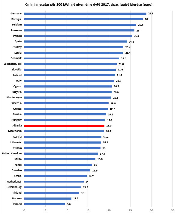 Eurostat vlerësoi se çmimi mesarat për 100 kwh energji në gjysmën e 20017 në Shqipëri ishte 8.6 euro, në Serbi është 7 euro, në Maqedoni 8.1 euro, në Kosovë 6.5 euro dhe në Malin e Zi 10 euro.