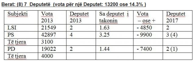 Berat: (8) 7 Deputetë (vota për një Deputet: 13200 ose 14.3% )