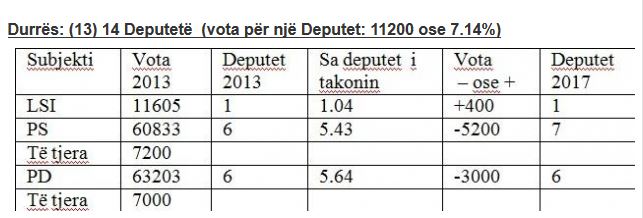 Në rubrikën “të tjera” në ishkualicionin e PD në Durrës ka peshë të konsiderueshme vota e PDIU, që sot është subjekt më vete. Në rubrikën “të tjera” në ishkualicionin e PS në Durrës nuk ka ndonjë subjekt me peshë të madhe, mundet që ato vota të shkojnë për PS dhe deputetin që shtohet në këtë qark mund ta marrë PS, kalon nga 6 në 7.