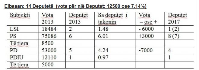 Elbasan: 14 Deputetë (vota për një Deputet: 12500 ose 7.14%)