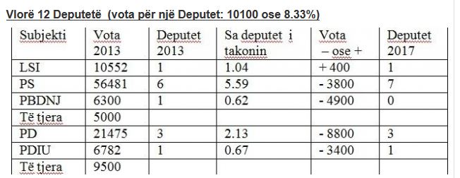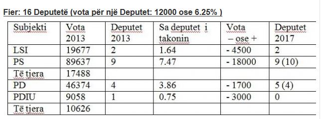 Në rubrikën “të tjera” në ishkualicionin e PS në Fier ka 17488 vota dhe këto janë parti që në shumicë do të rekomandojnë votën e tyre për PS prandaj PS mund të shkojë lehtësisht në 10 mandate. LSI duhet të mbrojë dy mandatet e 2013, në të kundërt mandatin e humbur mund ta marrë PDIU.