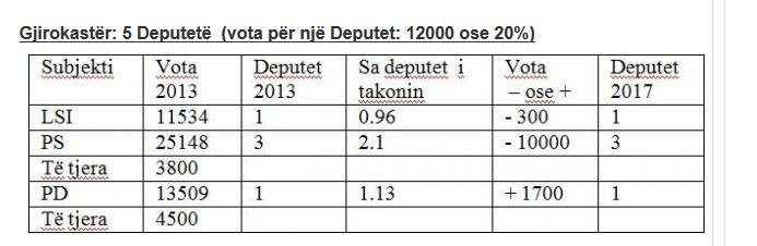 Në Qarkun Gjirokastër është shumë e vështirë për LSI të kalojë në dy mandate kur është më pak se një të tillë, po kështu dhe për PD, i duhet të rikuperojë 0.87 mandate për të marrë dy të tillë. PS nuk i ka tre mandate por është në avantazh.