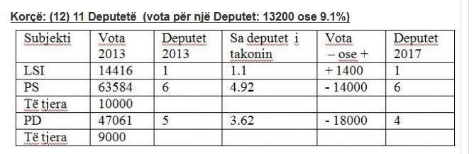 Në Qarkun Korçë, PD e ka të pamundur të kalojë katër mandate edhe sikur gjith votat e rubrikës “të tjera” të ishkualicionit t’i maksimizojë. LSI i duhet gati të dyfishojë votat e saj që të mund të marrë dy mandate. Më e lehtë është për PS për të ruajtur mandatin e gjashtë, në rubrikën “të tjera” të ishkualicionit ka rezervë të madhe.