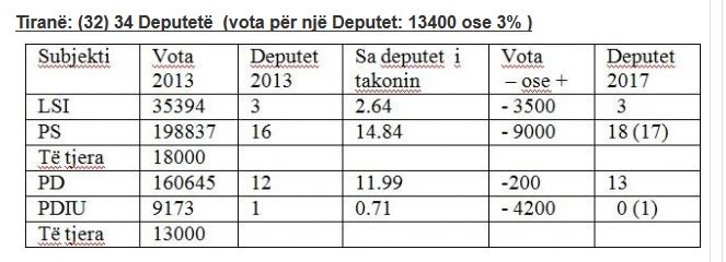 Në qarkun Tiranë, LSI e ka të vështirë të shtojë një mandat pasi i duhet të mbrojë të tretin. PS ka rezervë për një mandat nga rubrika “të tjera” pra shkon lehtësisht në shtatëmbëdhjetë. PD ka rezervë për një mandat nga rubrika “të tjera” pra shkon në trembëdhjetë. PDIU i duhet të rikuperojë shumë vota që të kalojë pragun. Partitë e tjera: FRD, SFIDA, LIBRA do përbënin surpriz nëse do të merrnin nga një mandat, pasi u duhet të kalojnë pragun 3%, që do të thotë mbi 13000 vota.
