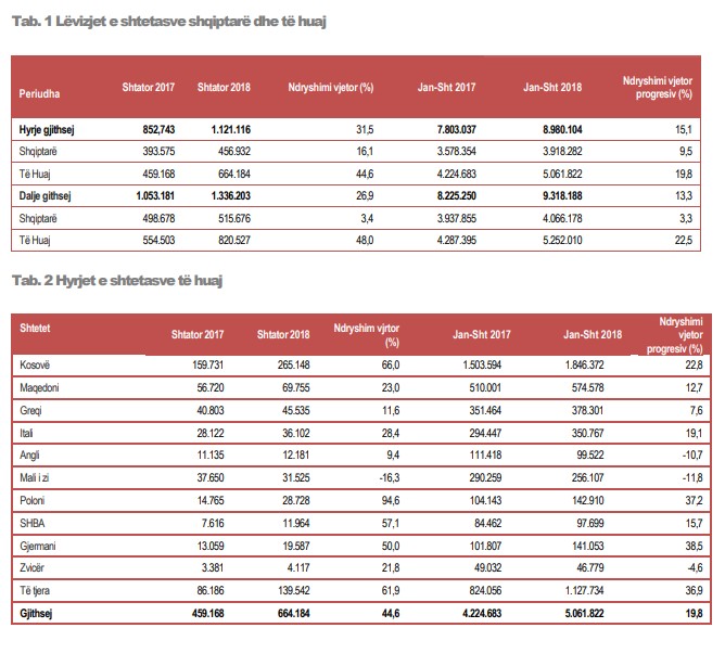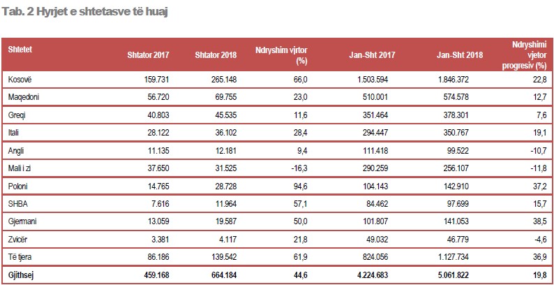 Numri i shtetasve shqiptarë dhe të huaj të hyrë në territorin shqiptar, në muajin Shtator 2018, është 1.121.116, krahasuar me shtator 2017, ky tregues rezulton me rritje 31,5 %. Në Shtator 2018, numri i shtetasve të huaj të hyrë në vend është 664.184. Krahasuar me Shtator 2017, ky numër është rritur me 44,6 %. Numri i shtetasve të huaj të hyrë në vendin tonë në nëntëmujorin e 2018 është 5.061.822 duke u rritur me 19,8 %, në krahasim me të njëjtën periudhë të vitit 2017.