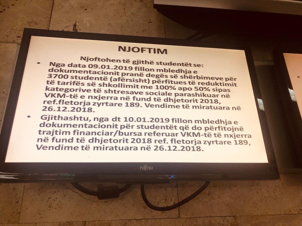 Në Fakultetin Ekonomik është projektuar njoftimi se nga data 9 janar 2019 fillon mbledhja e dokumentacionit pranë degës së shërbimeve për 3700 studentë afërsisht, përfitues të reduktimit të tarifës së shkollimit me 100% apo 50% sipas kategorive të shtresave sociale parashikuar në VKM-të e nxjerrja në fund të dhjetorit 2018.