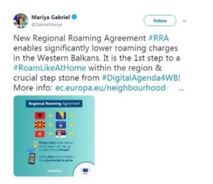 Nga ana tjetër për marrëveshjen e arritur mes vendeve të rajonit, komisionerja evropiane për Ekonominë dhe Shoqërinë Dixhitale, Mariya Gabriel, reagoi përmes një statusi në Twitter: