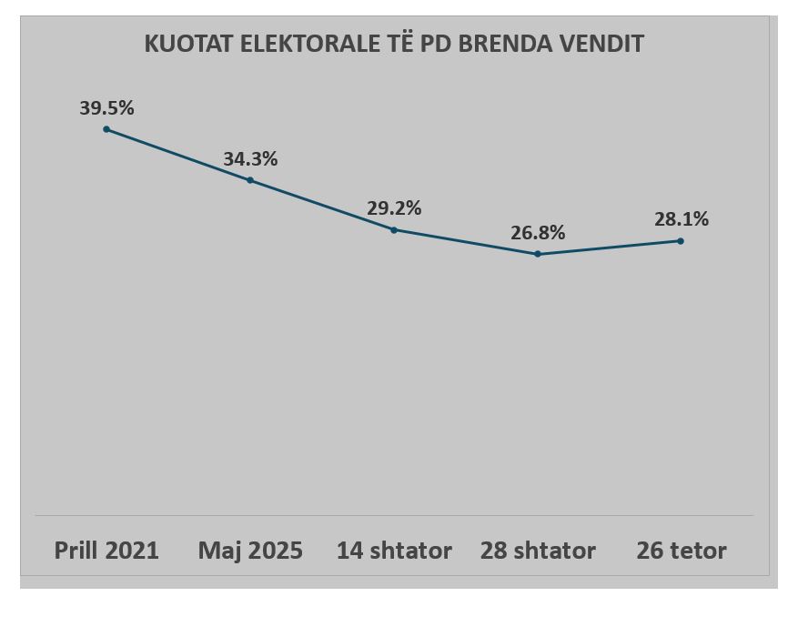 Në zgjedhjet parlamentare të majit 2025, PD-ja e zotëruar plotësisht nga Berisha (juridikisht dhe realisht) mori vetëm 34.3% të votave të këtushme (në votat nga emigracioni doli edhe më keq). Pra, krahasuar me prillin e 2021-shit, PD-ja rrëshkiti 5.1 pikë poshtë, edhe pse koalicionit të saj iu bashkangjit LSI-ja (përveç partive të vogla aleate të saj të mëparshme).