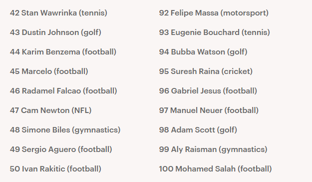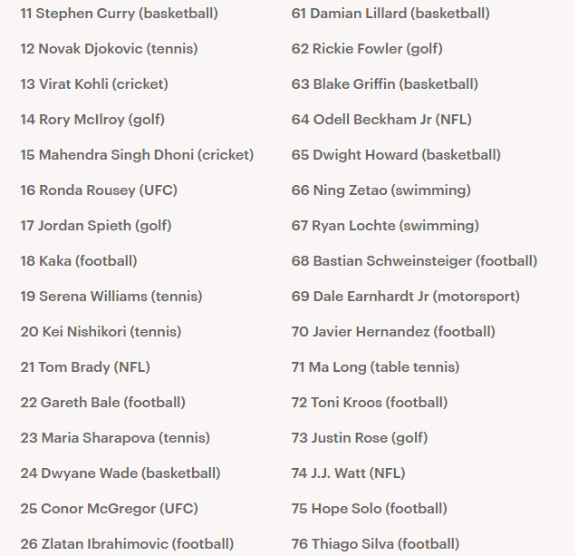 Në top pesëshe hyjnë tenisti Roger Federer në vendin e katërt dhe golfisti Phil Mickelson.Në mesin e 50 sportistëve më të famshëm nuk është asnjë sportist shqiptar, përgatiti ”Express”. (b.an)