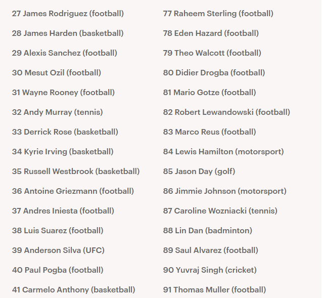 I dyti në listë është basketbollisti amerikan LeBron James, i ndjekur nga ylli argjentinas i Barcelonës, Leo Messi.