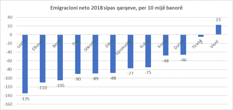 Më 2018 emigracioni neto për Lezhën ishte -135 persona për 10 mijë banorë, ndërsa ky tregues për Elbasanin ishte minus 110 persona për 10 mijë banorë dhe për Beratin 105 persona. Gjatë vitit të kaluar vetëm Vlora pa rritje emigracionin neto në vlera pozitive me 23 persona për 10 mije banorë, çka do të thotë se në këtë qytet raporti ndërmjet emigrantëve të kthyer dhe atyre të ikur pati një diferencë pozitive me mbi 400 persona.