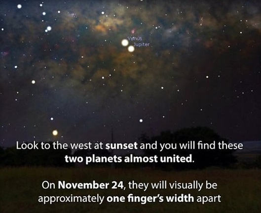 Venusi dhe Jupiteri janë afruar gjatë gjithë këtyre ditëve, ndërsa distanca më e afërt do të kulmojë mbrëmjen e 24 Nëntorit. Pavarësisht se janë qindra milionë kilometra larg njëri-tjetrit, sonte këto planete do të shfaqen pranë tyre duke formuar gati një vijë të drejtë me Tokën.