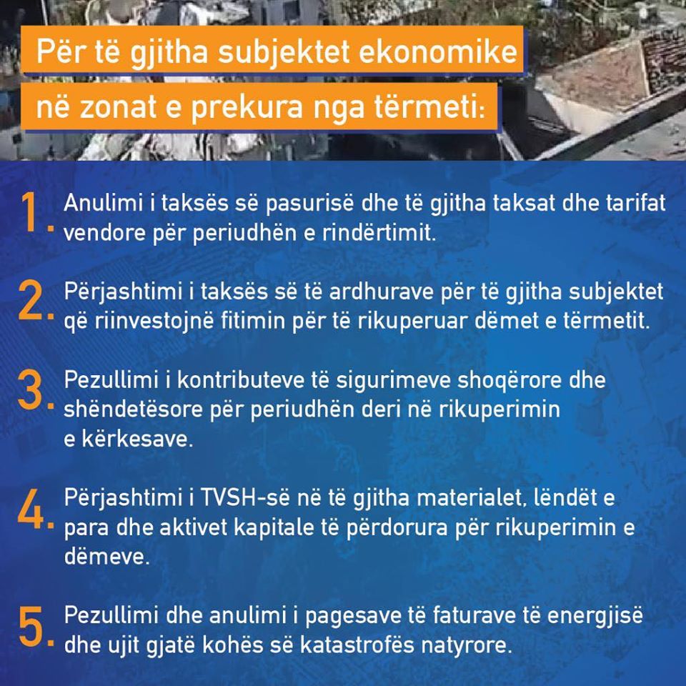 -Përjashtimi i taksës së të ardhurave për të gjitha subjektet që riinvestojnë fitimin për të rikuperuar dëmet e tërmetit.