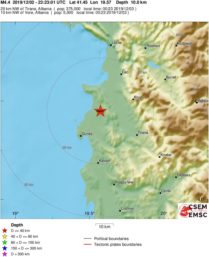 Epiqendra e tij ishte 10 kilometër në veriperëndim të Vorës, ndërkohë që lëkundjet u shënuan në orën 00.23.