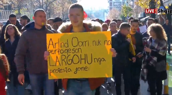 Në një pankartë të shpalosur nga studentët i kërkohet pedagogut Arlind Qori që të qëndrojë lart tyre. “Arlind Qori nuk na përfaqëson, largohu nga protesta jonë”, shkruhet në pankartë.