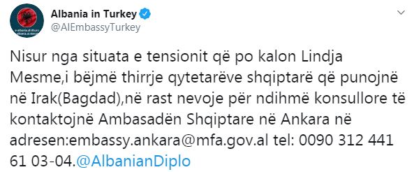 Pas tensioneve të ndezura tashmë në Lindjen e Mesme, ambasada shqiptare në Turqi i ka bërë thirrje të gjithë shqiptarëve që punojnë apo jetojnë në Irak të kontaktojnë nëse kanë nevojë nevojë për ndihmë.