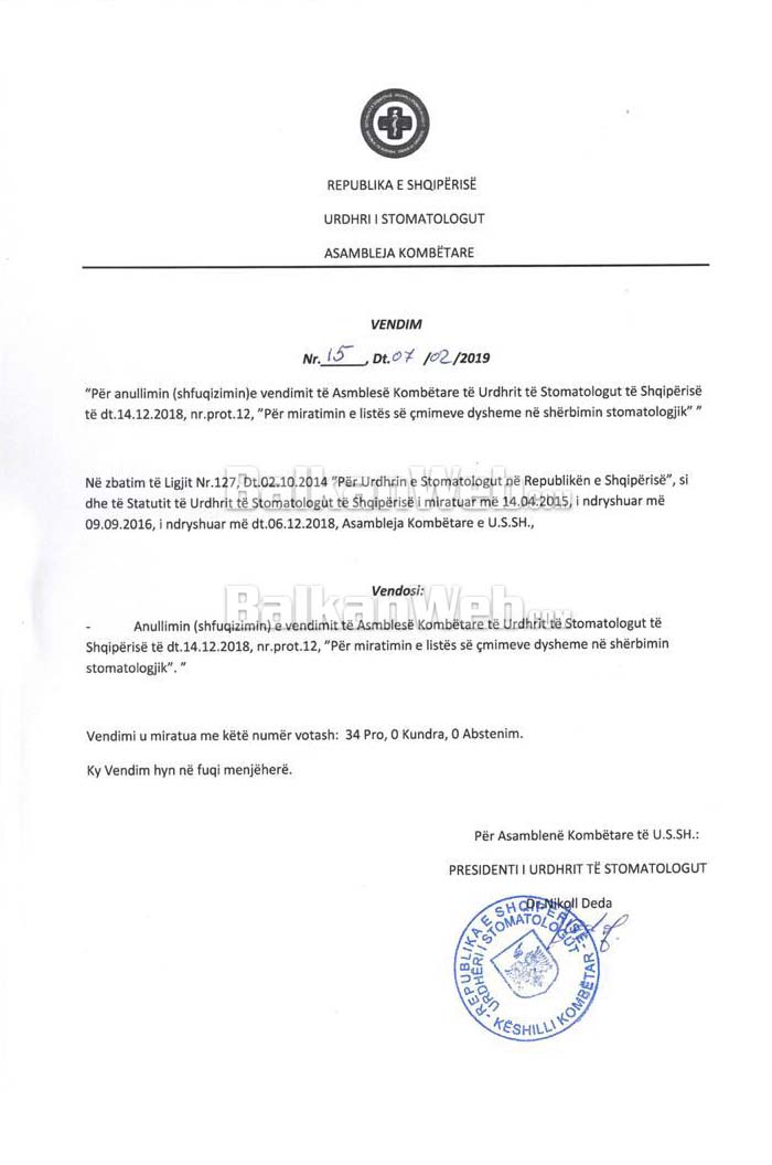 Në vendimin e firmosur nga Presidenti i Urdhrit të Stomatologut, Nikollë Deda thuhet se vendimi i anulimit është votuar me 34 vota pro dhe asnjë kundër.