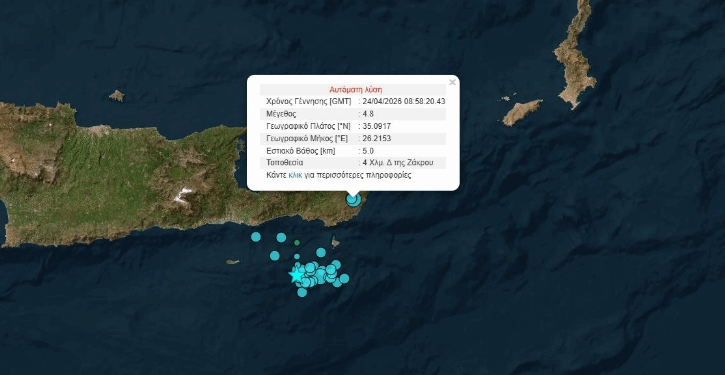 Një tërmet i ri me magnitudë 5 ballë të shkallës Rihter është regjistruar sot (24 prill) në zonën detare të Lassithit, në Kretë, vetëm disa orë pas lëkundjes së fortë 5.7 ballë që u ndje në orët e para të mëngjesit.