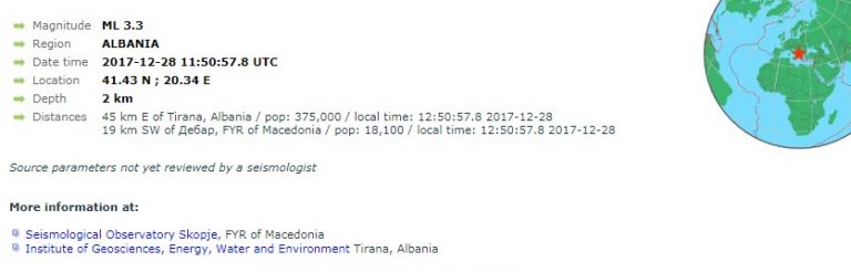 Një tërmet ka goditur Shqipërinë rreth orës 11:50. Sipas të dhënave nga sizmiologjia, tërmeti ka qenë me magnitudë 3.3 dhe ndjerë në Bulqizë dhe në Tiranë.