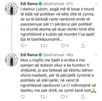 “I dashur Lulzim, asgjë më të keqe s’mund të bëjë një politikan në këto ditë të zymta, se sa të kërkojë raste njerëzish ende të pasistemuar për t’i përdorur për politikë! Ka shumë akoma që duan dorën tonë dhe ngrohtësinë e kujtdo që mundet t’ua japë! Eja të bashkëpunojmë…Mos u mjafto me fjalët e errëta e me pamjen që dukesh sikur e ke humbur ti shtëpinë, jo ata fatkeqë që kështu bëhen sfond mediatik, për të përcjellë zymtinë e politikës së stërvjetër, nē vend të ngrohtësisë njerëzore! Le t’i ndihmojmë së bashku me pak dritê, se zymti kanë boll🙏”, shkruan Rama.