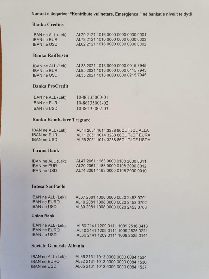 Për këtë arsye, janë hapur disa llogari në bankat e nivelit të dytë nga Emergjencat Kombëtare, ku secili mund të japë kontributin e tij për Shqipërinë dhe shqiptarët, për ata vëllezër e motra që u preken nga lëkundja e jashtëzakonshme e tërmetit, që humbën shtëpinë, vëllain, motrën, nënën.