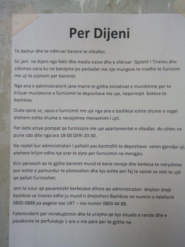 “Siç jeni në dijeni nga fakti dhe media vizive dhe e shkruar Qytetit të Tiranës dhe sidomos zona ku ne banojmë po përballet me një mungesë të madhe të furnizimit me ujë të pijshëm për banorët. Nga ana e administratorit janë marrë të gjitha iniciativat e mundshme për të krijuar mundësinë e furnizimit të depozitave me ujë, nëpërmjet boteve të bashkisë. Duke qene se, sasia e furnizimit me ujë nga ana e bashkisë është shumë e vogël, atëherë është shumë e nevojshme menaxhimi i ujit. Për këtë arsye pompat që furnizojnë me ujë apartamentet e shkallës do vihen në punë çdo ditë nga: ora 18-00 deri 20-30. Rastet kur administratori i pallatit pas kontrollit të depozitave vëren gjendje uji, atëherë krijon edhe një orar të dytë për furnizimin në mëngjes”, thuhet në njoftimin e vendosur nga administratori në një prej pallateve të njësinë Nr. 5 në Tiranë.