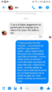 Pershendetje JOQ…dje shkruajta nje koment per emisionin e Eni Cobanit.dhash mendimin tim.ajo m u ka pergjigjur direkt ne mesenxher dhe me beri presion qe mos te bej gaf e te shkruaj me….dhe me ka fyer rende…i bera foto pergjigjes saj dhe te times se c fare i shkruajta…perdor diktatur se nuk i pelqeu sms ime…