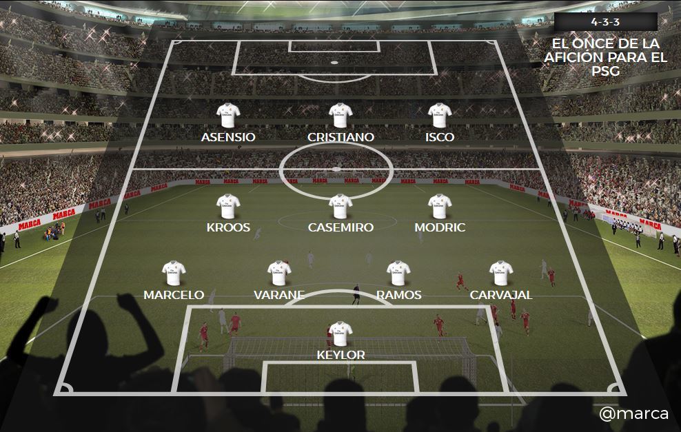 Në anketën e bërë nga MARCA, ku kanë votuar më shumë se 45.000 tifozë, kanë zgjedhur formacionin ideal për sfidën që Real Madridi e zhvillon me PSG-në sot mbrëma.