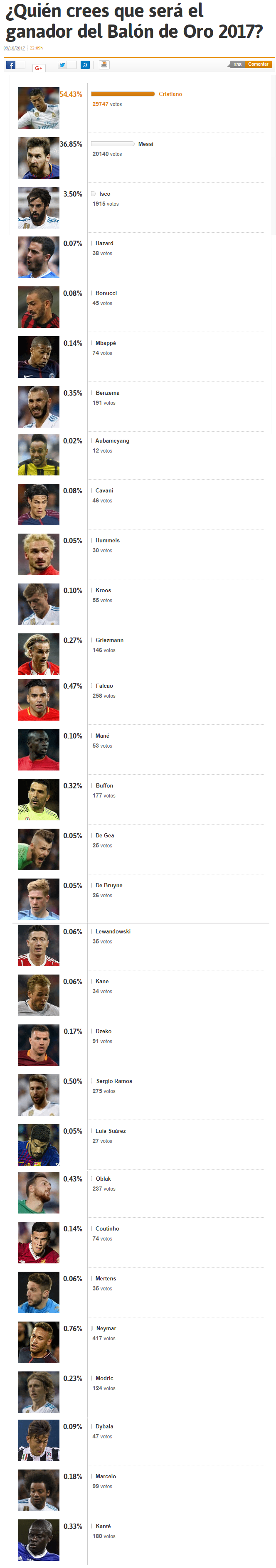 Në pyetjen se kush do ta fitojë Topin e Artë për vitin 2017 në anketën e AS, tifozët kanë votuar më shumë për Cristianon. 29 mijë e 747 votues mendojnë se portugezi do të fitojë Topin e Artë, pra 54.43%, ndërsa 36.85% apo 20 mijë e 140 votues kanë votuar për Messin.