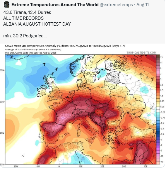 Të hënën më 11 gusht 2025, termometri shënoi temperaturën 43.6 gradë Celsius.