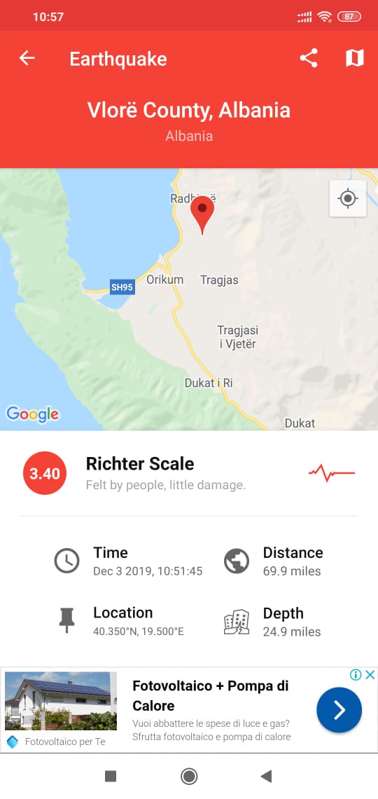 Një tjetër lëkundje tërmeti eshte ndiere ne Shqiperi me epiqender ne Radhime te Vlores.