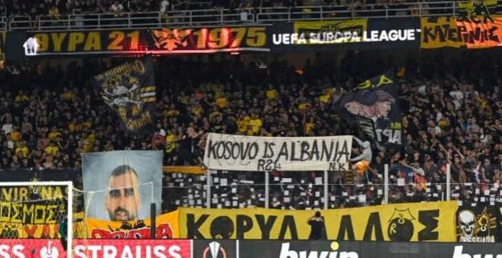 Banderola e shpalosur nga tifozët e AEK-ut të Athinës në ndeshjen ndaj Ajax, ku shkruhej: “Kosova është Shqipëri”, është konsideruar si tradhti dhe “thikë në zemër” nga serbët dhe mediat e këtij vendi.