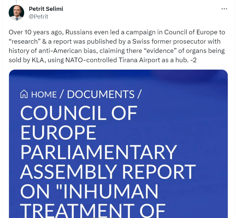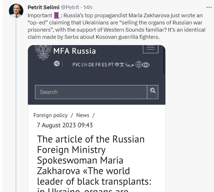 Ai shkruan në Twitter se shkrimi i Maria Zakharova-s është i njëjtë me pretendimet serbe daj UÇK-së për trafik organesh. Ai thekson se për më shumë se 10 vjet, Rusia ka bërë një fushatë në Këshillin e Evropës për të ‘hulumtuar’ raportin e Dick Marty-t e akuzat e tij ndaj UÇK-së për trafik organesh duke përdorur NATO-n. /Hashtag.al