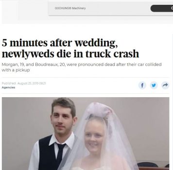Një çift amerikan vdiq tragjikisht në Teksas 5 minuta pas përfundimit të dasmës së tyre. Harley Morgan, 19-vjeç and Rhiannon Boudreaux 20-vjeç po udhëtonin me makinën e tyre kur një kamion që transportonte një traktor i goditi fort në autostradë dhe për pasojë çifti i ri ndërroi jetë në ditën më të bukur.